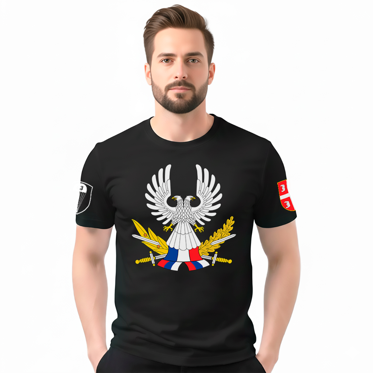 Muška crna majica sa upečatljivim simbolima i grbom 63. Padobranske brigade namenjena je onima koji cene snagu, hrabrost i tradiciju. Centralni motiv sa orlom i stilizovanim elementima nosi snažnu vizuelnu poruku koja se prepoznaje bez dodatnih objašnjenja, dok sveden dizajn ostaje dostojanstven i nenametljiv. Majica je izrađena od kvalitetnog pamuka, prijatna za svakodnevno nošenje, sa klasičnim krojem koji odgovara većini tipova građe, a štampa je jasna, detaljna i otporna na pranje. Crna boja dodatno ističe motiv i čini majicu lako uklopivom u svaki stil.