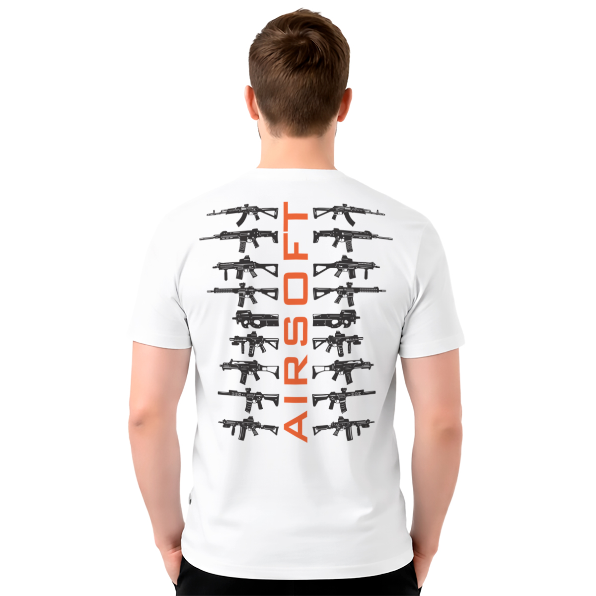 Muška bela majica sa motivom airsoft replika, idealna za ljubitelje taktičkog stila i airsoft igre. Udobna i praktična za svakodnevno nošenje ili teren.