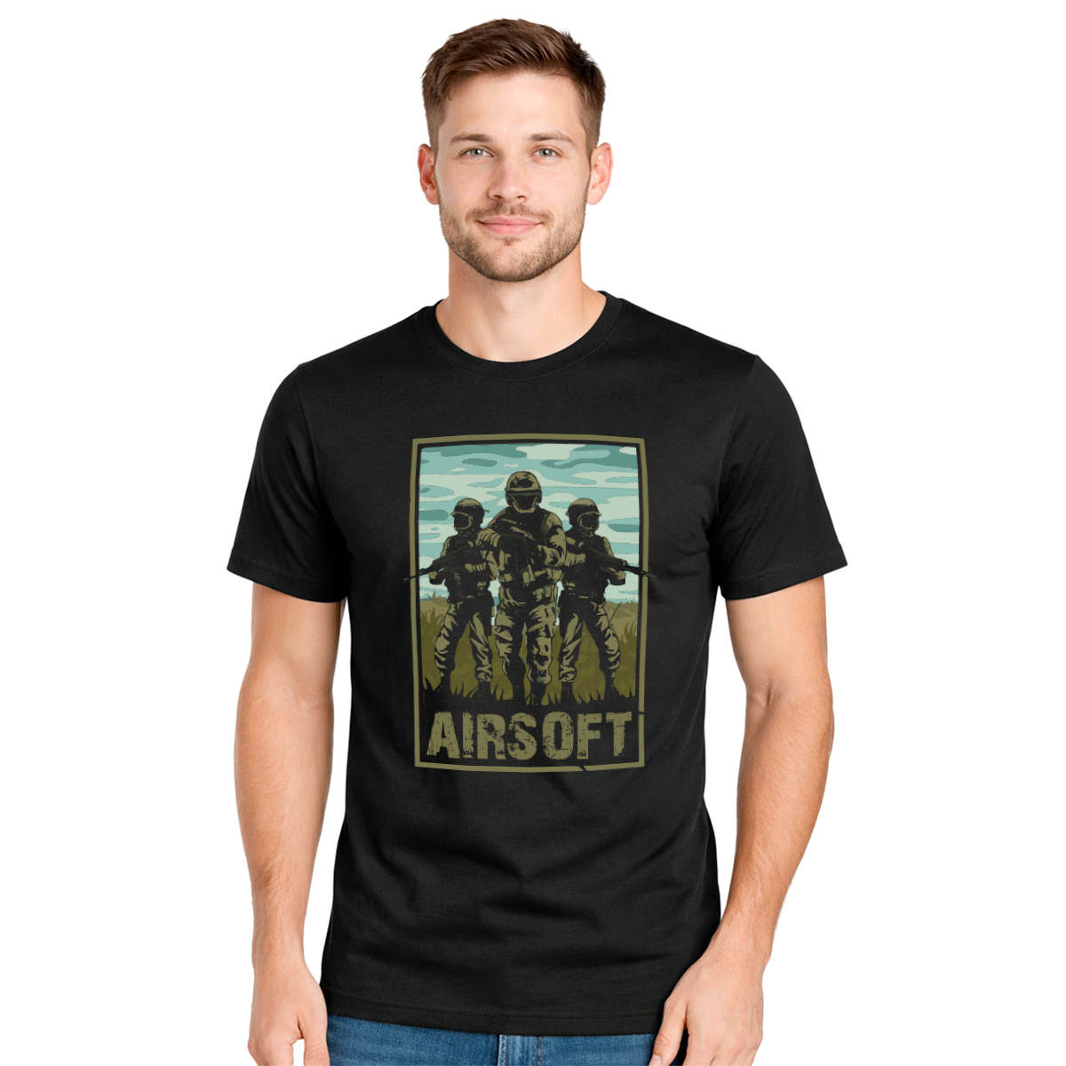 Muška crna majica sa motivom ‘Airsoft soldiers’, namenjena ljubiteljima akcije i timskog duha. Udobna i kvalitetna, lako se kombinuje sa farmerkama ili trenerkama.