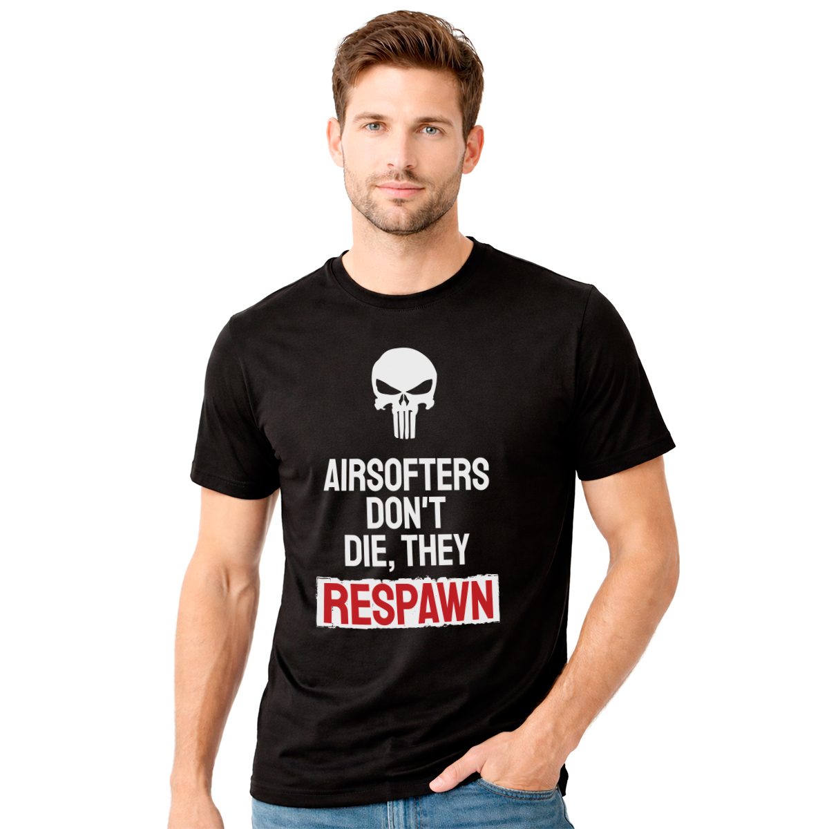 Muška crna majica sa natpisom ‘Airsofters don’t die, they respawn’, savršena za prave airsoft entuzijaste. Upečatljiv dizajn sa dozom humora i taktičkog duha.