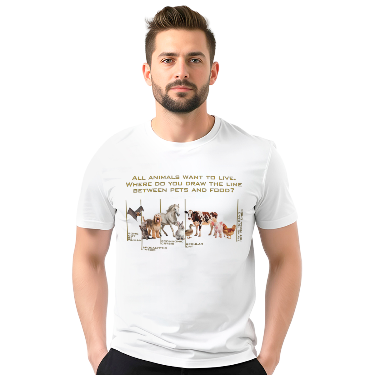 Ova muška bela majica nosi poruku ‘All animals want to live’ i predstavlja duhovitu parodiju na poznatu PETA kampanju ‘Gde je granica između kućnog ljubimca i hrane’. Namenjena je onima koji vole crni humor, ironiju i majice koje teraju na razmišljanje uz osmeh. Bela boja daje čist i neutralan izgled, dok poruka nosi celu foru. Kroj je klasičan i udoban, idealan za svakodnevno nošenje i opuštene prilike. Majica nema nameru da ikoga uvredi, već da se našali na račun savremenih kampanja i navika. Štampa je kvalitetna i postojana, pa poruka ostaje jasna i posle mnogo pranja. Savršena je za ekipu koja voli satiru i ne shvata sve previše ozbiljno. Ako voliš majice sa stavom i dozom provokacije, ovo je pravi izbor.
