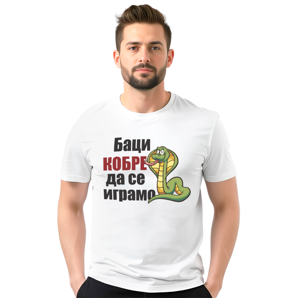 Muška bela majica sa natpisom ‘Baci kobre da se igramo’ donosi sirovi balkanski humor i prepoznatljiv street vajb koji nikoga ne ostavlja ravnodušnim. Bela podloga daje jak kontrast natpisu i čini poruku još upadljivijom. Ovaj model je namenjen onima koji vole provokativne fore, dupli smisao i opuštenu komunikaciju bez filtera. Klasičan kroj i prijatan materijal obezbeđuju udobnost tokom celog dana, bilo da si u gradu, na žurci ili sa ekipom na bleji. Majica se lako kombinuje uz farmerke, šorts ili trenerku. Kvalitetna štampa garantuje postojanost i dug vek trajanja. Ako voliš humor sa stavom i poruke koje se pamte, ovo je komad za tebe.