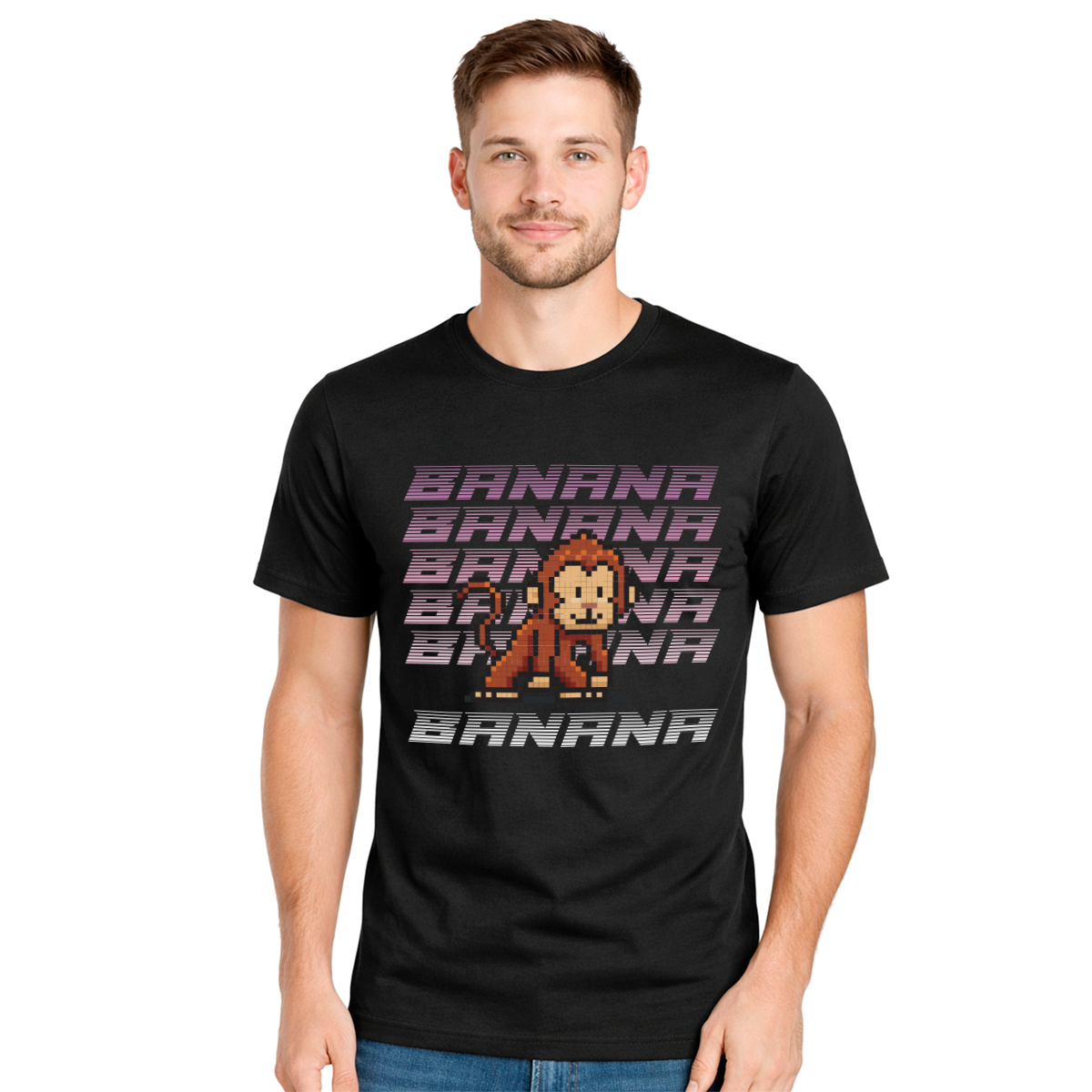 Ova muška crna majica sa motivom Banana Monkey u 8bit stilu vraća te pravo u vreme arkadnih igrica i ranih konzola. Pixel dizajn nosi jak retro šmek i odmah privlači pažnju. Namenjena je svima koji vole gejming kulturu, meme estetiku i malo otkačen humor. Crna podloga dodatno ističe grafiku i daje čist street izgled. Kroj je klasičan i udoban, idealan za svakodnevno nošenje. Majica se lako kombinuje uz farmerke, trenerku ili patike. Štampa je kvalitetna i postojana, bez pucanja i bledenja. Ako voliš retro, pixel art i majice sa karakterom, ova je pun pogodak.