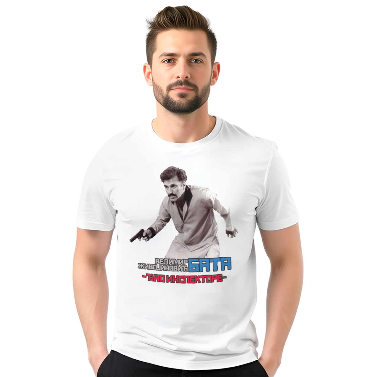 Bela muška sa štampom lika Bate Živojinovića iz filma Ćao inspekotre.