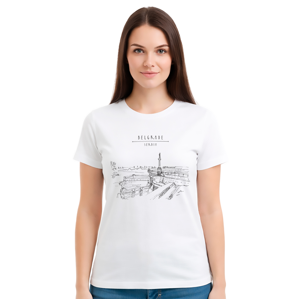 Ženska bela majica sa motivom Beograda i tvrđave Kalemegdan. Elegantna ilustracija jednog od najlepših simbola grada.