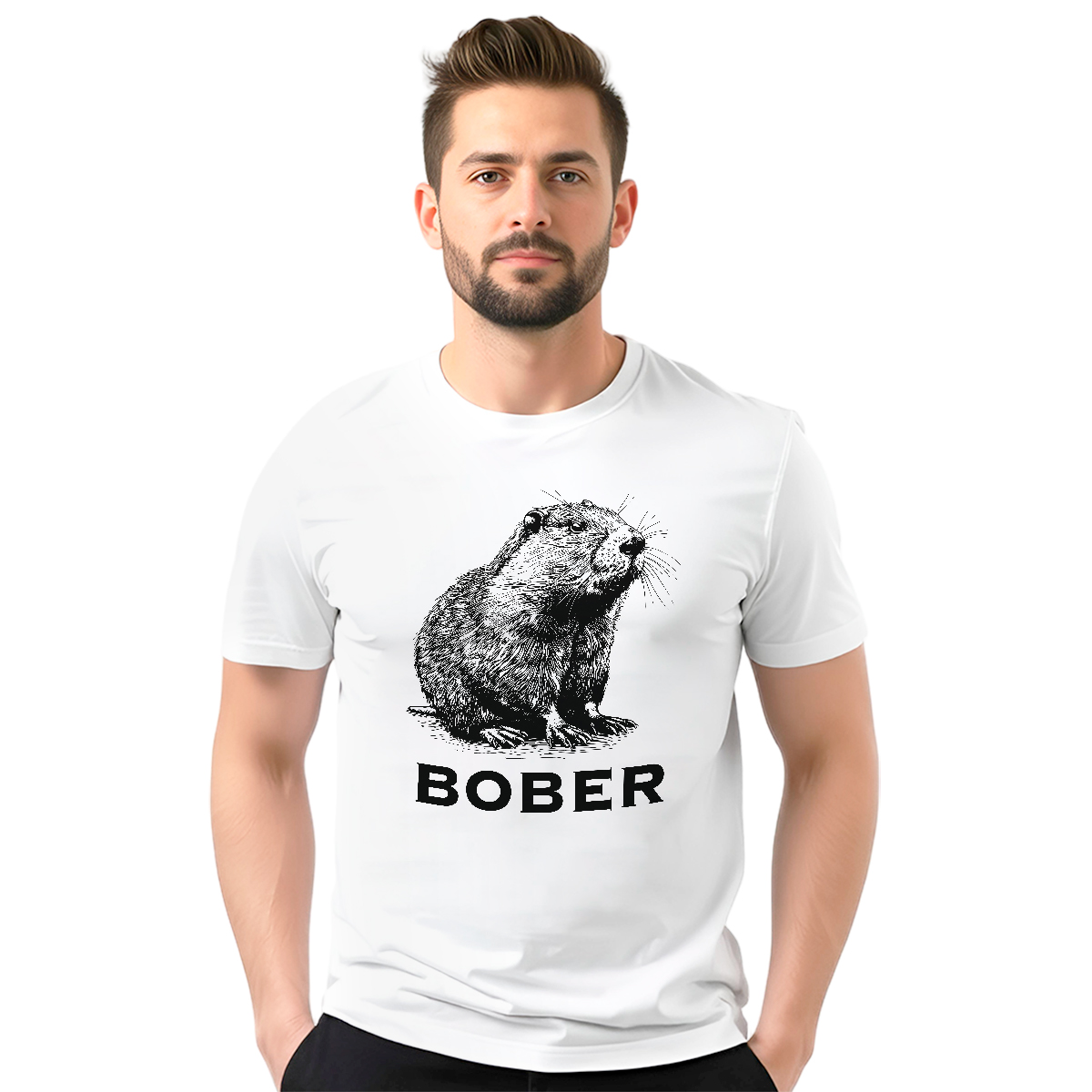Bela muška majica sa motivom bobera za one koji vole humor i opušten stil. Jednostavan dizajn koji lako upada u oko i nosi se bez razmišljanja.