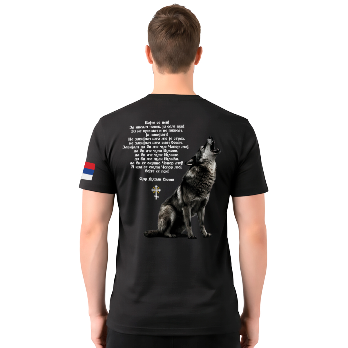 Muška crna majica ‘Bojte se psi’ sa slikom vuka i rečima Cara Dušana na leđima, te zastavom Srbije na levom rukavu, nosi stav, snagu i ponos. Savršena za patriote sa karakterom i stilom.