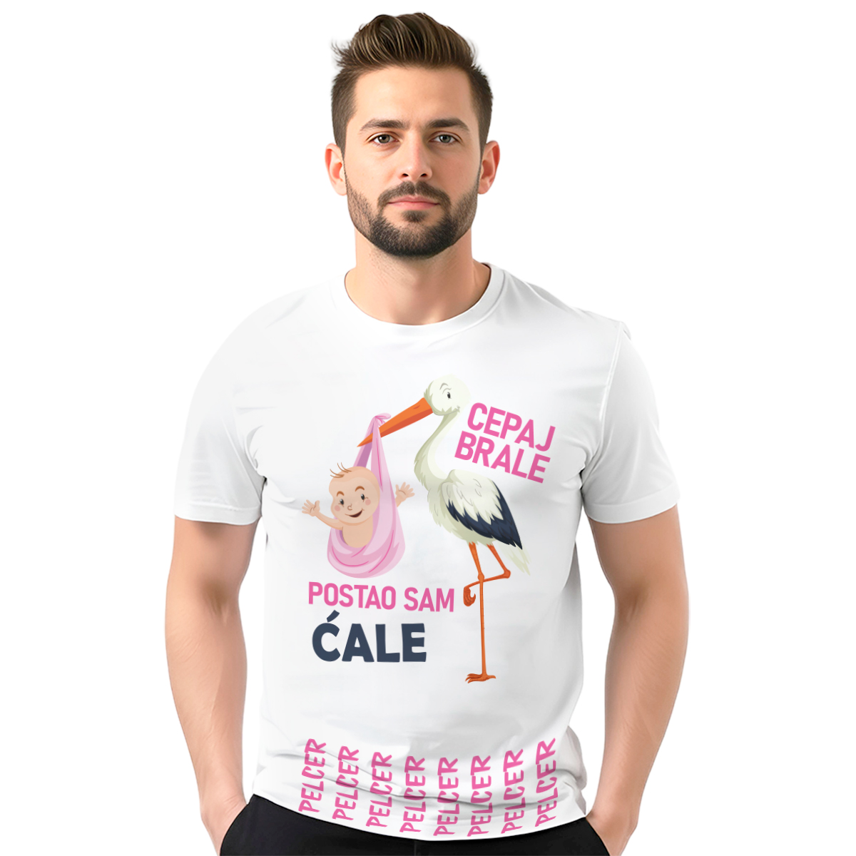 Muška bela majica sa natpisom ‘Cepaj brale, postao sam ćale’, savršen poklon za nove tate. Udobna i kvalitetna, lako se kombinuje sa farmerkama ili trenerkama.