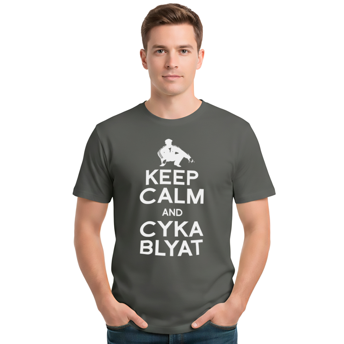 Keep calm and Cyka blyat – muška tamno siva majica sa duhovitim natpisom za one koji vole šalu i meme kulturu.