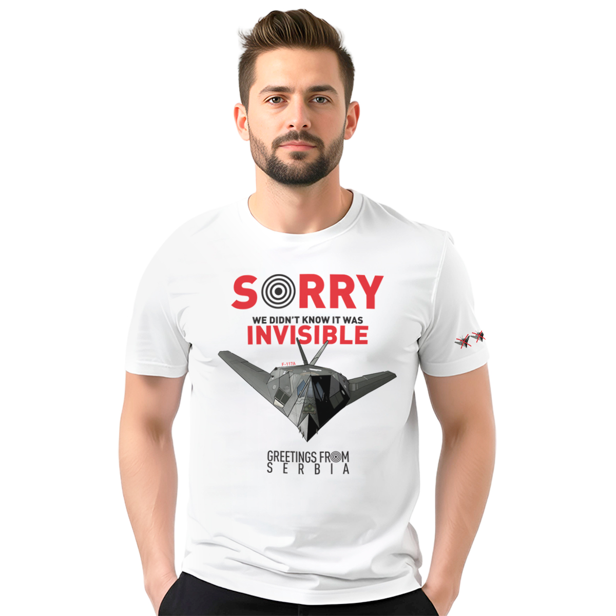 Muška bela majica koja podseća na 1999. godinu i obaranje F-117A ‘nevidljivog’ aviona. Poruka nosi simbol otpora, snalažljivosti i ponosa uprkos nadmoćnom neprijatelju.