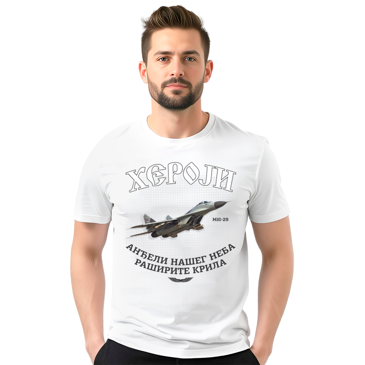 Muška bela majica ‘Heroji’ posvećena pilotima na MIG-29 avionima koji su branili nebo 1999. godine. Poštovanje i sećanje na hrabrost i patriotizam.