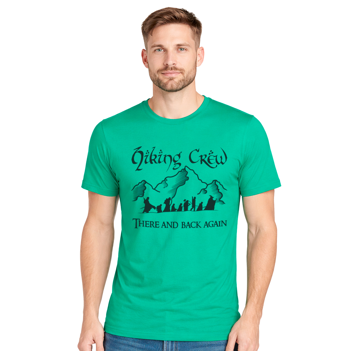 Muška smaragdno zelena majica sa natpisom ‘Hiking Crew’ i ilustracijom inspirisanom družinom iz Gospodara prstenova. Idealan izbor za fanove avanture i fantasy sveta.
