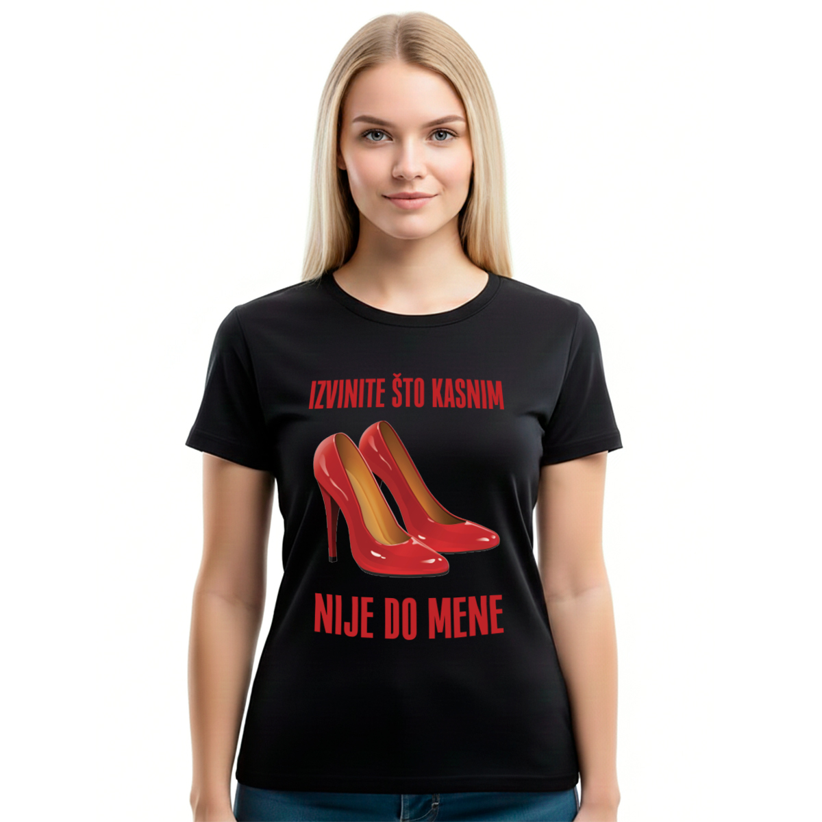 Ženska crna majica sa natpisom ‘Izvinite što kasnim’. Duhovit statement za sve koje kasne sa stilom.