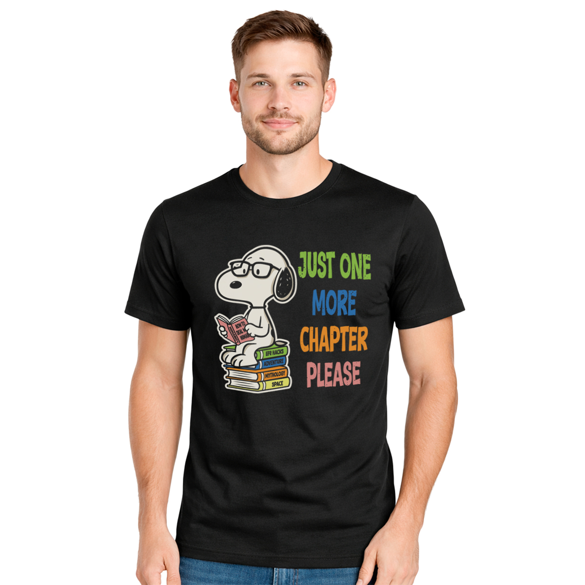 Muška crna majica sa natpisom ‘Just one more chapter please’ i ilustracijom Snoopy-ja, savršena za ljubitelje knjiga. Udobna i kvalitetna, lako se kombinuje sa farmerkama ili trenerkama.