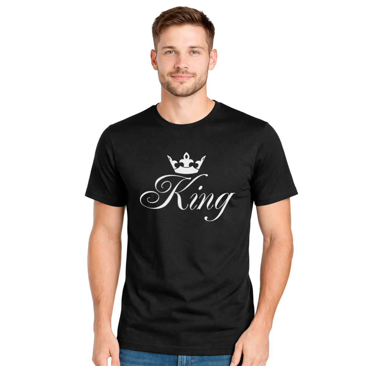 Muška crna majica ‘King’ za zaljubljene parove sa stavom. Ima svoju žensku verziju ‘Queen’, savršeno za Valentinovo i Dan zaljubljenih.