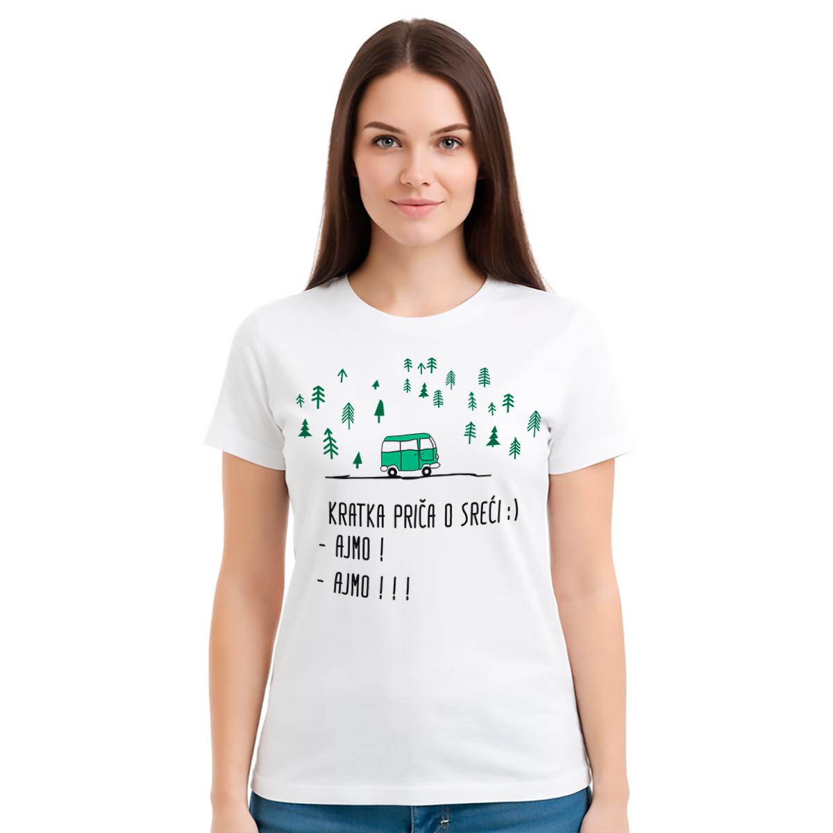 Ženska bela majica sa natpisom i ilustracijom ‘Kratka priča o sreći’ za one koji znaju da su male stvari najbitnije. Tiha poruka, ali jak utisak.