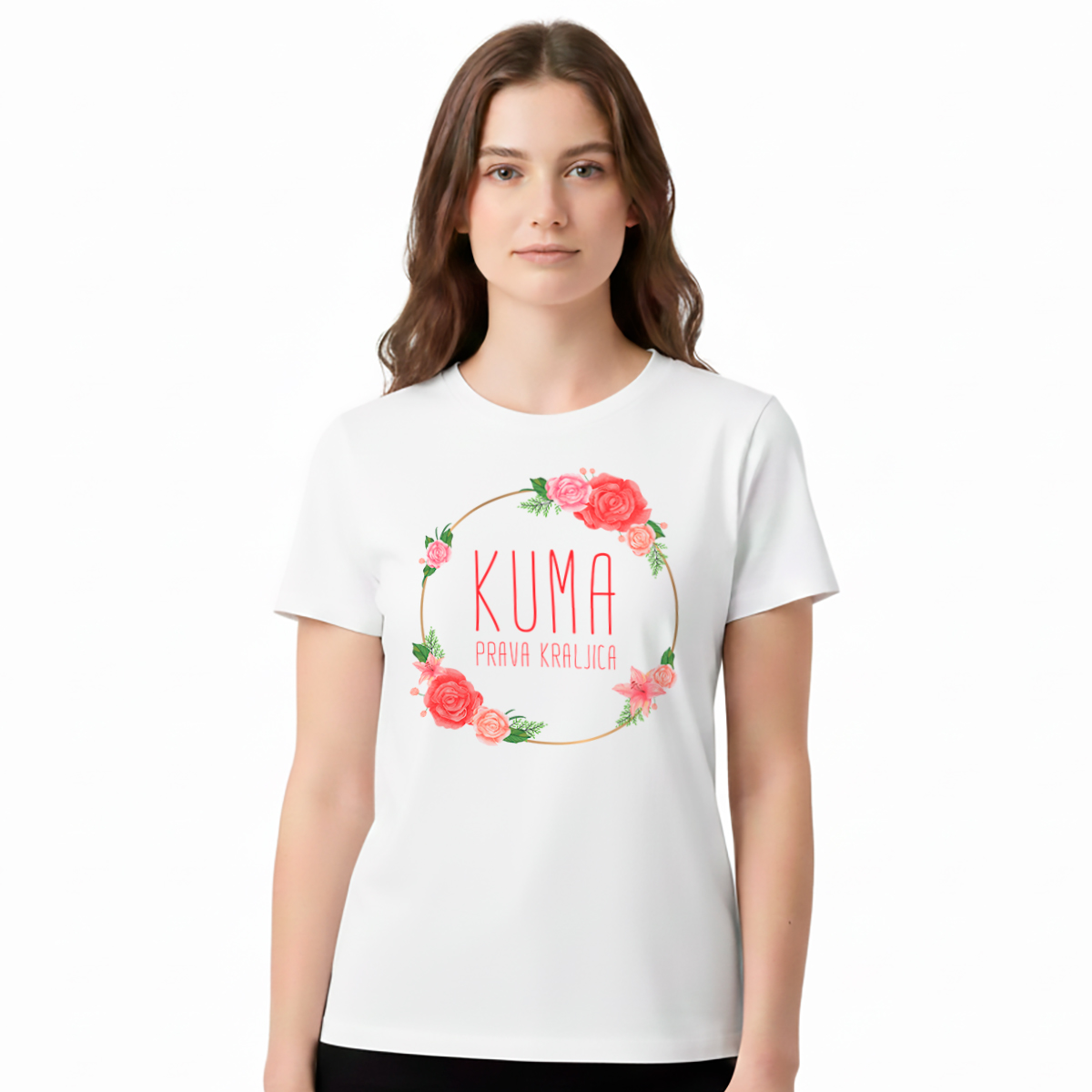 Ženska majica sa natpisom ‘Kuma prava kraljica’. Idealan poklon za kumu, udobna i kvalitetna za svakodnevno nošenje.
