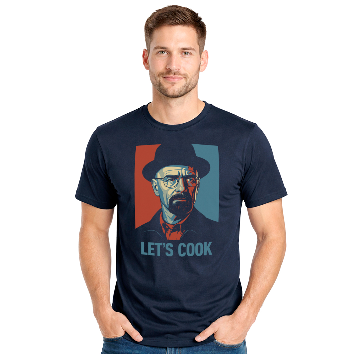 Muška teget majica sa motivom ‘Let’s cook’ i likom Hajzenberga, odnosno Voltera Vajta iz serije ‘Breaking Bad’. Udobna i kvalitetna, lako se kombinuje sa farmerkama ili trenerkama.