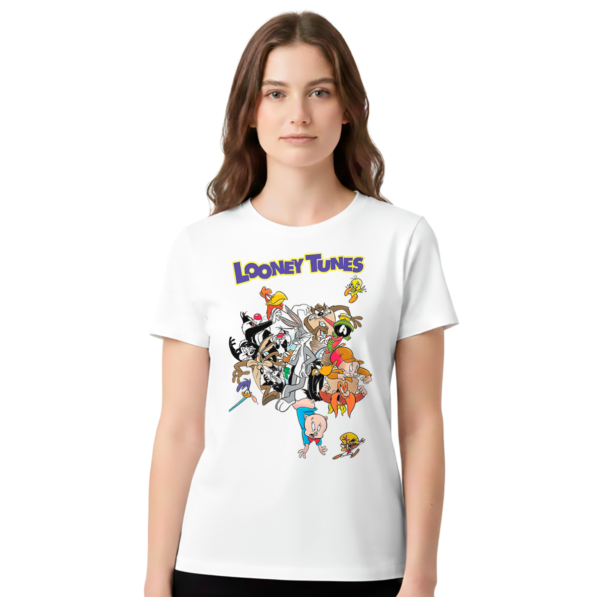 Ženska bela majica sa motivom Looney Tunes družine, idealna za ljubitelje kultnih crtanih likova i opuštenog, razigranog stila.