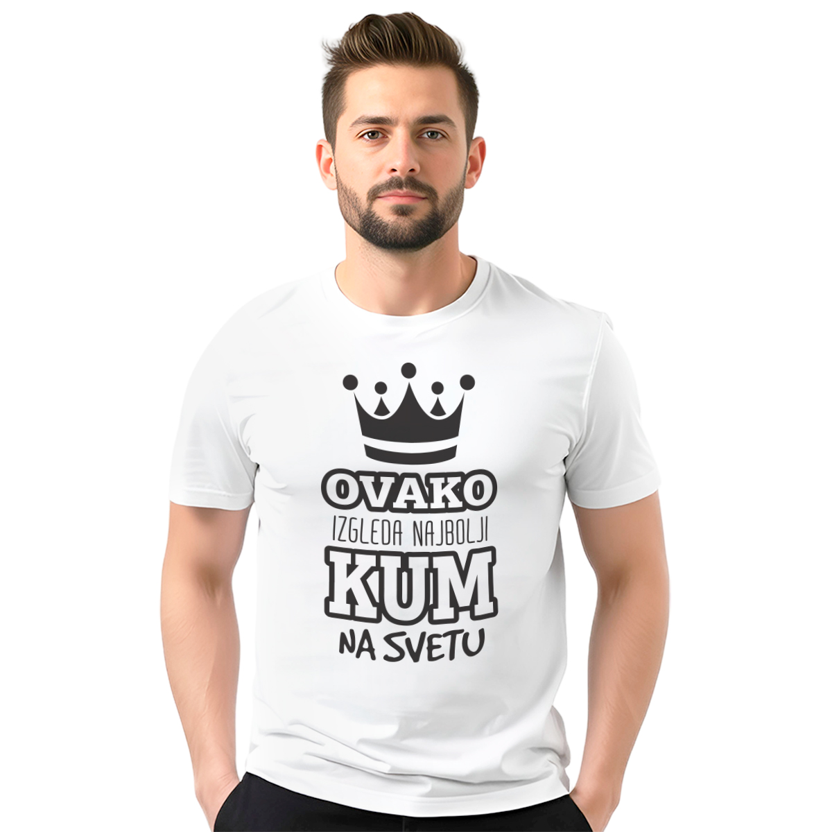 Muška bela majica ‘Ovako izgleda najbolji kum na svetu’, savršen poklon za kumove koji zaslužuju priznanje i osmeh.