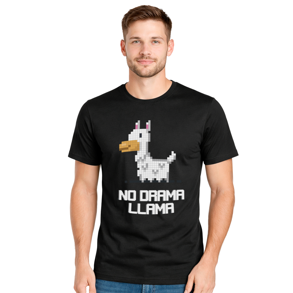Muška crna majica sa 8bit motivom lame i porukom ‘No drama Llama’ za one koji vole mir, humor i retro vajb. Pixel stil i jasna poruka bez filozofije.