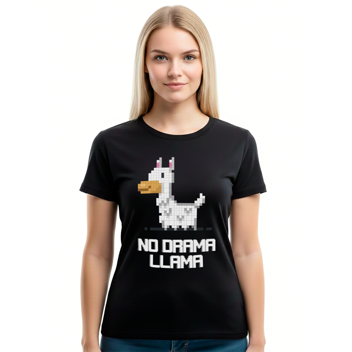 Ženska crna majica sa motivom ‘No Drama Llama’ u 8-bit stilu. Retro gaming vajb sa porukom bez drame.