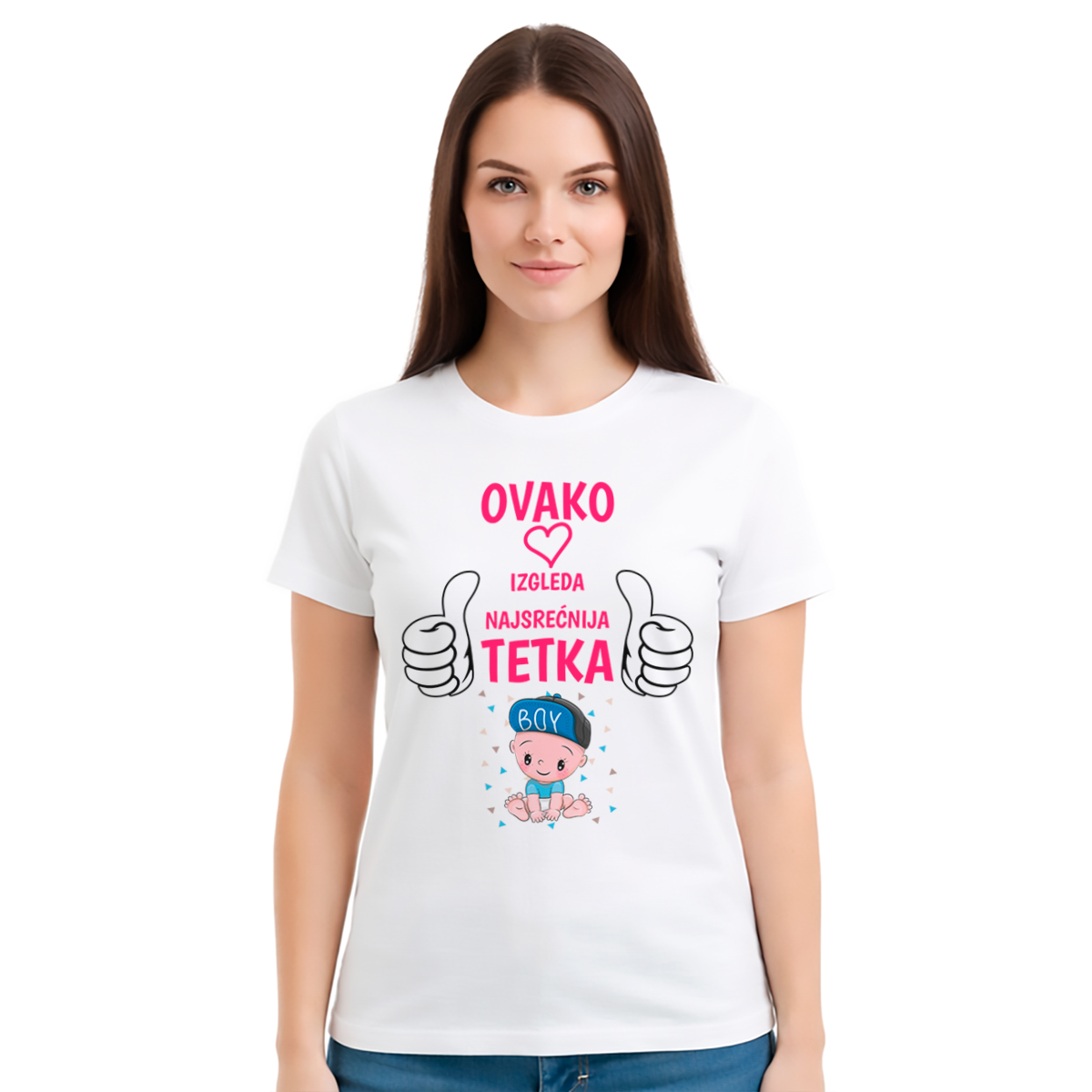 Ova ženska bela majica je idealan poklon povodom rođenja dečaka i namenjena tetki koja odmah preuzima posebnu ulogu. Natpis ‘Ovako izgleda najbolja tetka (boy)’ jasno i nežno ističe radost i ponos tog trenutka. Majica nosi toplu poruku koja ostaje uspomena i dugo nakon prvih dana sa bebom. Bela boja daje čist i svečan izgled, savršen za fotografije i prve posete. Udobna je i prijatna za nošenje tokom celog dana. Lako se kombinuje uz svakodnevne odevne varijante. Namenjena je kao simbol pažnje, ljubavi i nove porodične radosti. Mali detalj koji ima veliko značenje.