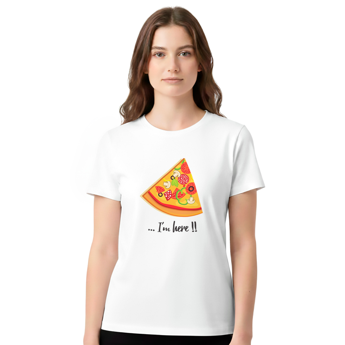 Ženska bela majica sa parčetom pice i natpisom ‘I’m here’. Deo seta majica za parove, savršena za poklon.