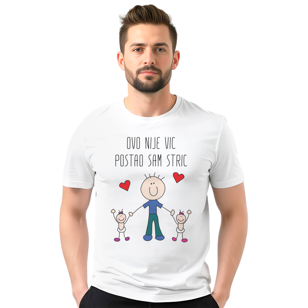 Muška bela majica sa natpisom ‘Ovo nije vic, postao sam stric’. Savršen poklon za novopečenog strica, udobna i kvalitetna za svakodnevno nošenje.