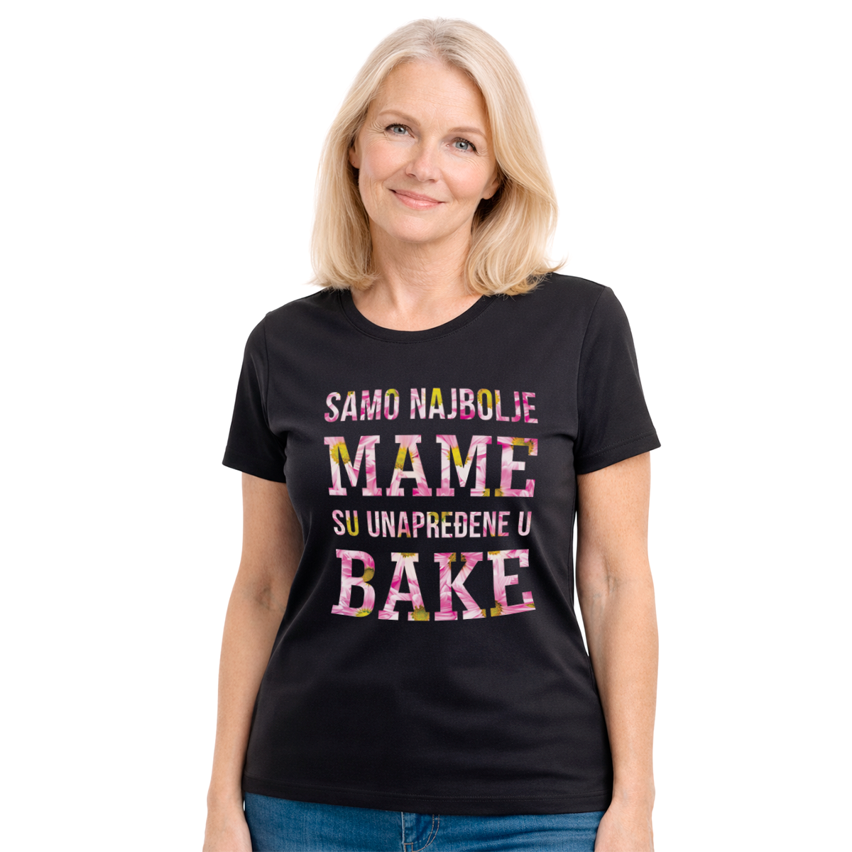 Ova ženska crna majica nosi poruku ‘Samo najbolje mame su unapređene u bake’ i govori sve bez dodatnih reči. Namenjena je ženama koje su svoju majčinsku ulogu iznele vrhunski i sada uživaju u tituli bake. Crna boja daje elegantan i ozbiljan izgled, dok natpis unosi toplinu i emociju. Kroj je udoban i pogodan za celodnevno nošenje, bilo kod kuće ili u šetnji. Majica se lako kombinuje uz farmerke, patike ili jaknu. Štampa je kvalitetna i postojana, pa poruka ostaje jasna i posle mnogo pranja. Savršena je za porodična okupljanja, poklon ili posebne prilike. Ako želiš da pokažeš ponos i ljubav prema porodici, ova majica je pravi izbor.