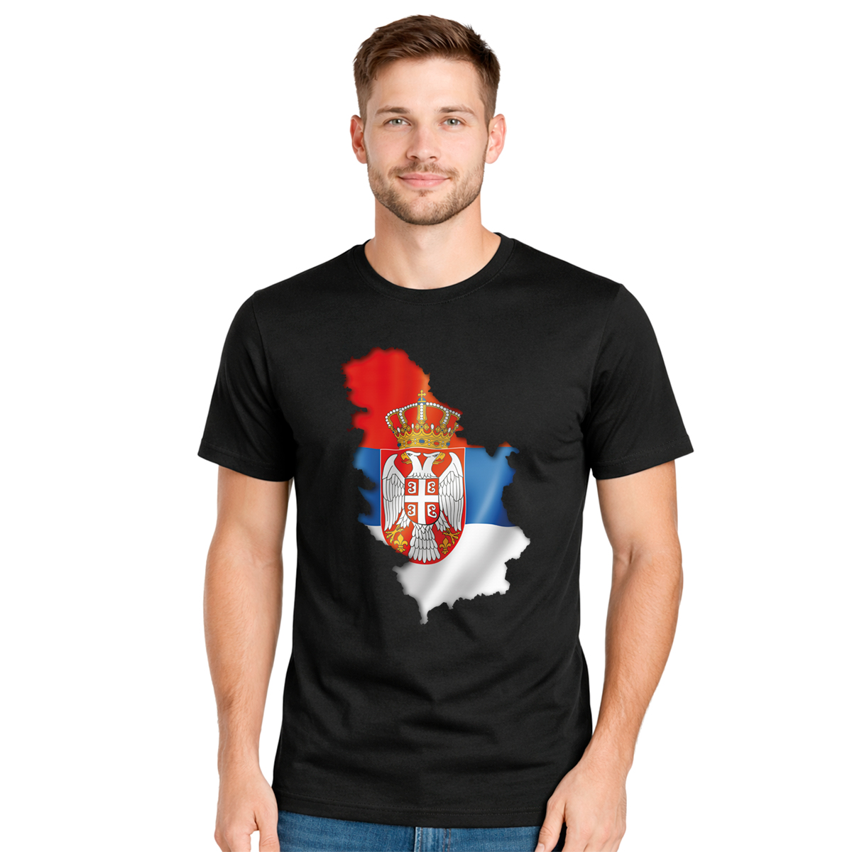 Muška crna majica ‘Srbija’ sa ilustracijom naše zemlje napred nosi ponos i patriotizam. Savršen izbor za svakog ko želi da jasno pokaže ljubav prema domovini.