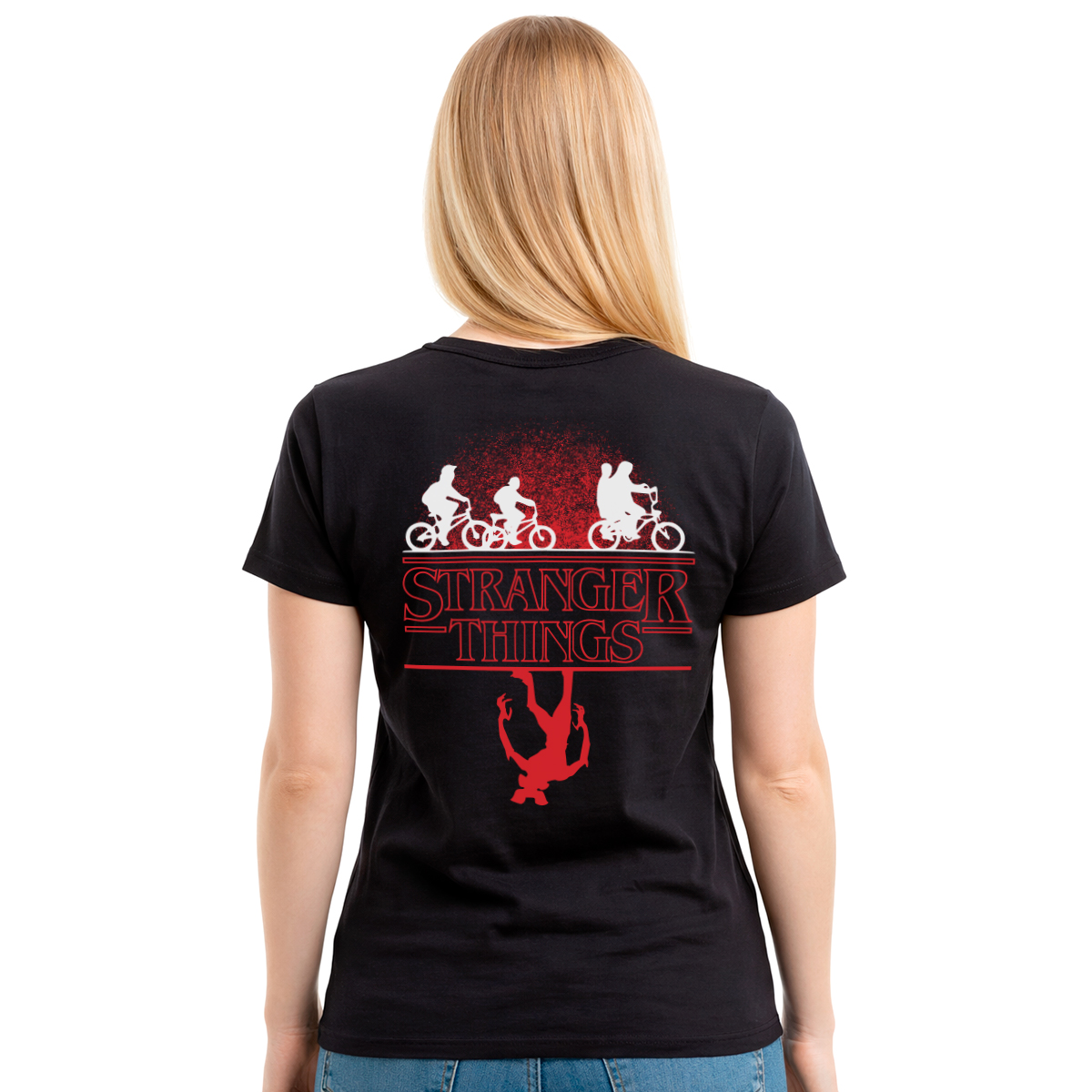 Ženska crna majica sa motivom Stranger Things. Kultni retro dizajn za ljubiteljke misterije i sci-fi atmosfere.