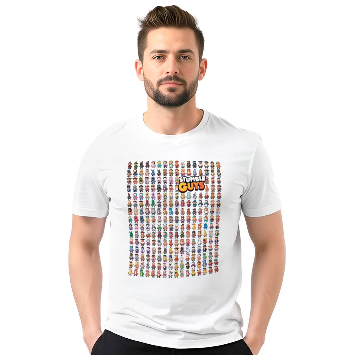 Muška bela majica sa motivom iz igre Stumble Guys savršen je izbor za fanove zabavnih i dinamičnih igara. Udobna i moderna, idealna je za svakodnevno nošenje.
