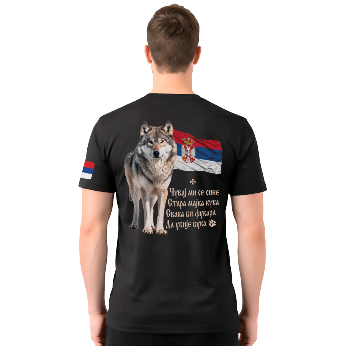 Muška crna majica ‘Svaka bi fukara da ubije vuka’ sa zastavom Srbije na levom rukavu i štampom na leđima nosi poruku snage i nacionalnog ponosa. Savršen izbor za prave patriote sa stavom.