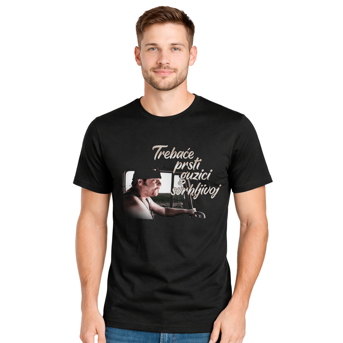 Muška crna majica sa natpisom ‘Trebaće prsti guzici svrbljivoj’, inspirisana kultnim filmom ‘Mrtav ladan’. Udobna i kvalitetna, lako se kombinuje sa farmerkama ili trenerkama.