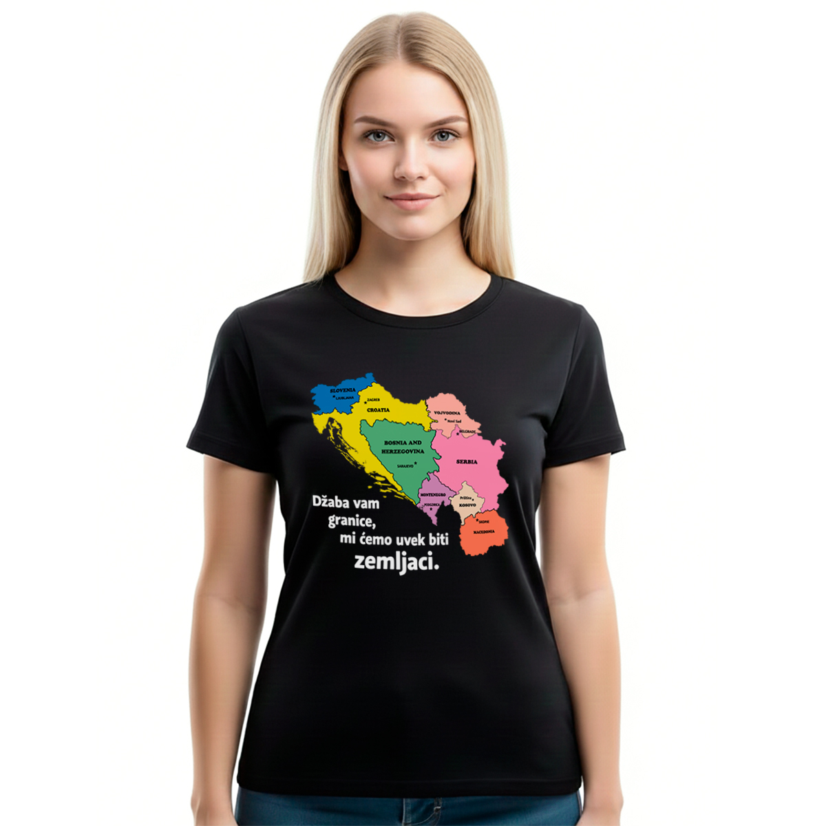 Crna ženska majica za sve koje prave pravu ekipu. Natpis ‘Džaba vam granice mi ćemo uvek biti zemljaci’ šalje jasnu poruku zajedništva i fazona.