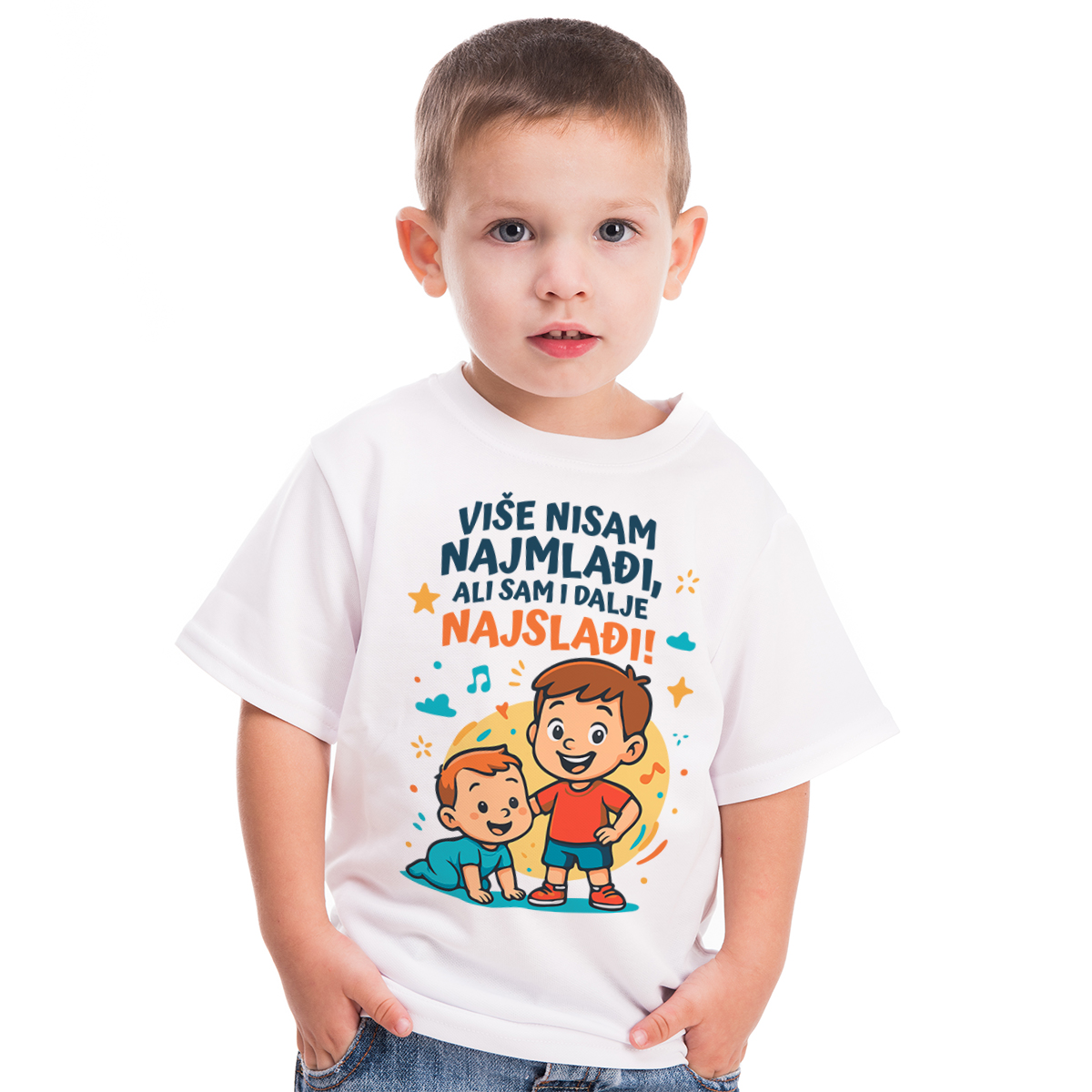 Dečija bela majica sa humorističnim printom „Više nisam najmlađi“, savršena za slavlje rođenja novog člana porodice. Napravljena od mekanog i kvalitetnog pamuka, nežnog prema dečijoj koži, udobna je za svakodnevno nošenje. Atraktivan print donosi zabavu i osmeh u garderobu vašeg deteta. Idealna za poklon, porodične proslave ili svakodnevnu upotrebu.