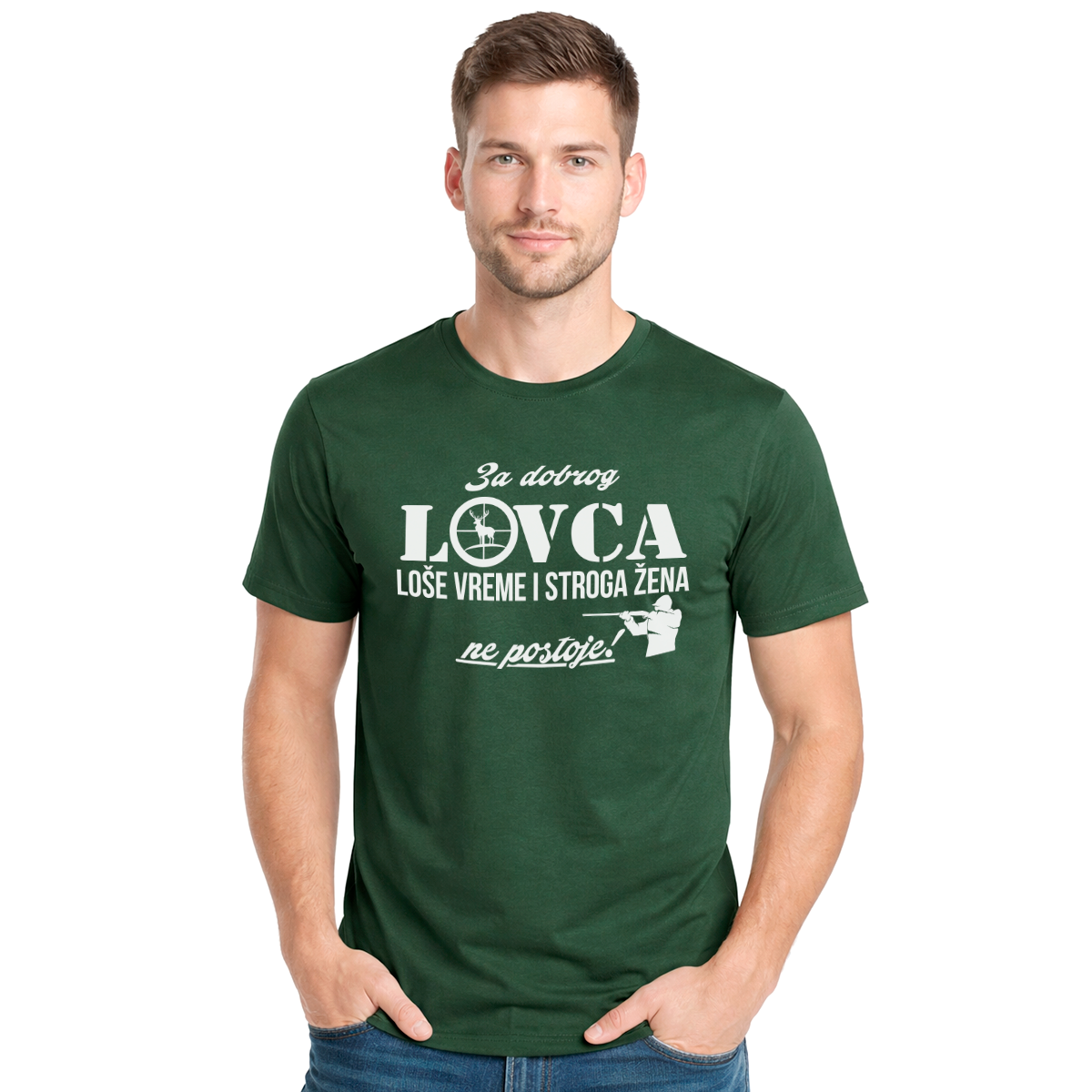 Tamno zelena muška majica za one koji ne priznaju izgovore. Natpis ‘Za dobrog lovca loše vreme i stroga žena ne postoje’ nosi humor i pravi lovački stav.